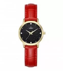 Đồng hồ nữ SRWATCH SL8581.1404 với mặt số tròn, được đính hạt kim tuyến như bầu trời đêm lấp lánh, kim chỉ và vạch số được thiết kế nhỏ gọn, khung viền kim loại được mạ vàng và quai đeo dây da màu đỏ có vân thời thượng