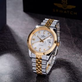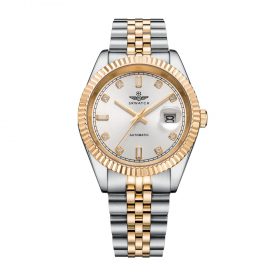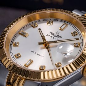 Đồng hồ nam SRWATCH SG88805.1202AT với mặt tròn, vỏ đồng hồ phối hai tông màu vàng trắng, các vạch chỉ giờ đính đá sang trọng cùng ba kim màu vàng nổi bật trên nền mặt số màu trắng hài hòa với các cọc số màu vàng sang trọng. Vỏ đồng hồ được kết hợp với dây đeo bằng thép không gỉ, thiết kế độc đáo và được phủ lớp mạ PVD hai tông màu vàng trắng. Đây là mẫu đồng hồ tự động (automatic), trang bị mặt kính sapphire chống trầy xước, lịch ngày tiện dụng vị trí 3 giờ và khả năng chống nước 5ATM, mang lại sự yên tâm cho người dùng khi sử dụng hằng ngày.